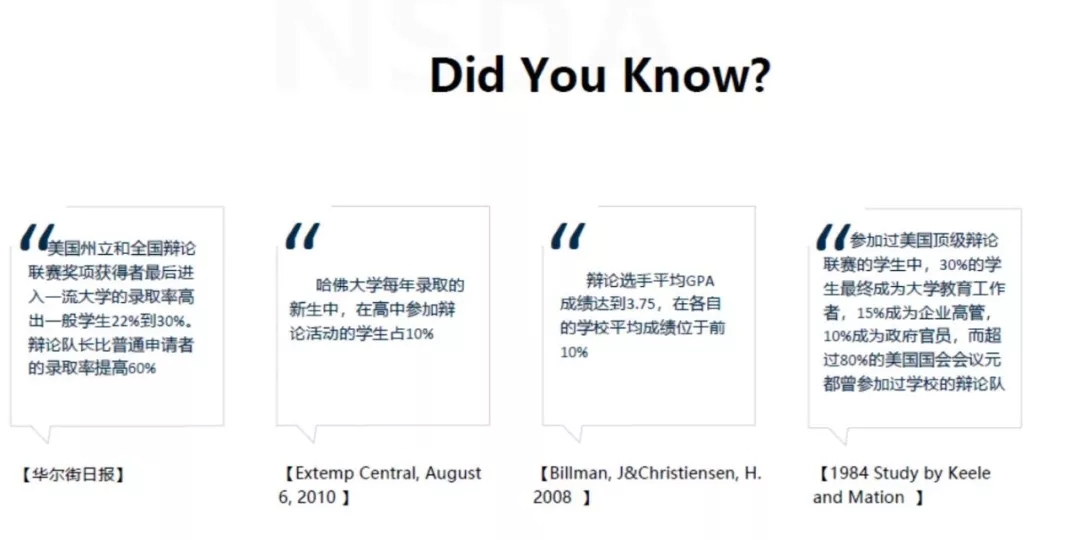 NSDA(National Speech and Debate Association)是全美演讲与辩论联赛,是美国历史最悠久、规模最大的中学演讲与辩论荣誉组织。如果拥有NSDA的比赛经历和积分,将会成为以后国内,特别是国外继续求学的大大加分项!!!表现优异者也将会收到由NSDA中国办公室发出的全国总决赛邀请函;并有机会获得NSDA总部的特邀,参加每年在美国举行的NSDA全美总决赛,一展辩才。