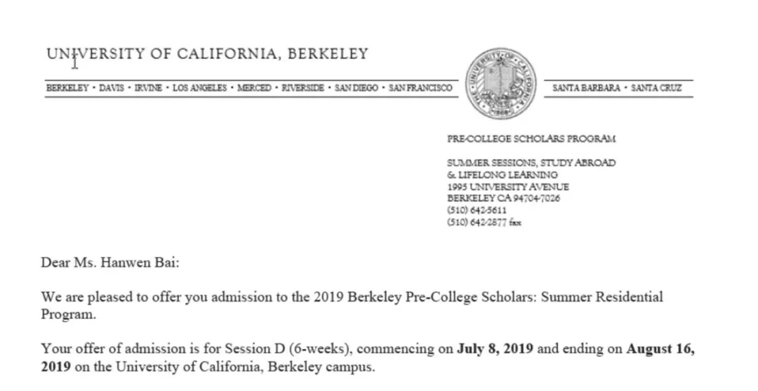 哥伦比亚大学&加州伯克利夏校录取双offer丨祝贺郑州47中中美白涵文同学获美国顶尖名校夏校录取