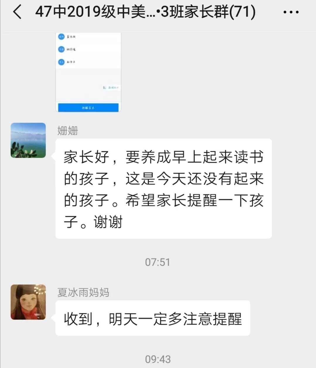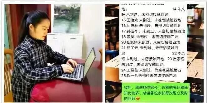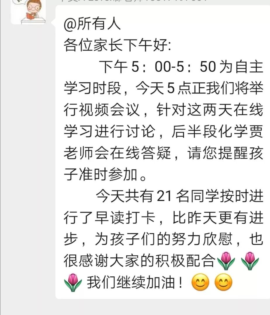 尽管准备充分,但是网络授课现阶段毕竟还存在一定的技术局限性。在老师们没有办法像正常课堂那样面对面保证每一个学生的学习状态时,班主任统计了每一天学生的出勤情况,在线时长,和任课老师分别沟通学生的表现,在每一天课程结束之后及时形成文字,在班级群里进行总结,对表现优异的学生提出表扬,同时对暂时没有恢复学习状态的学生及家长进行单独沟通。