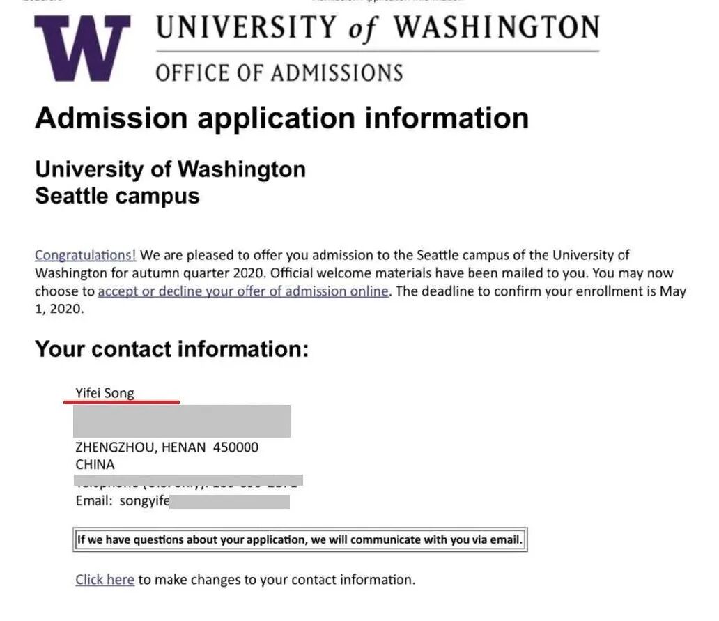 宋奕飞 同学拿到 华盛顿大学 录取通知书!