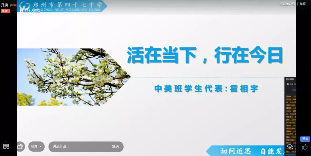 2020年3月30日,郑州市第四十七中学教育集团国际部全体师生升旗仪式在线举行。作为优秀学生代表,中美班&剑桥A Level班学子霍相宇代表全体国际部学生在升旗仪式上进行了发言。