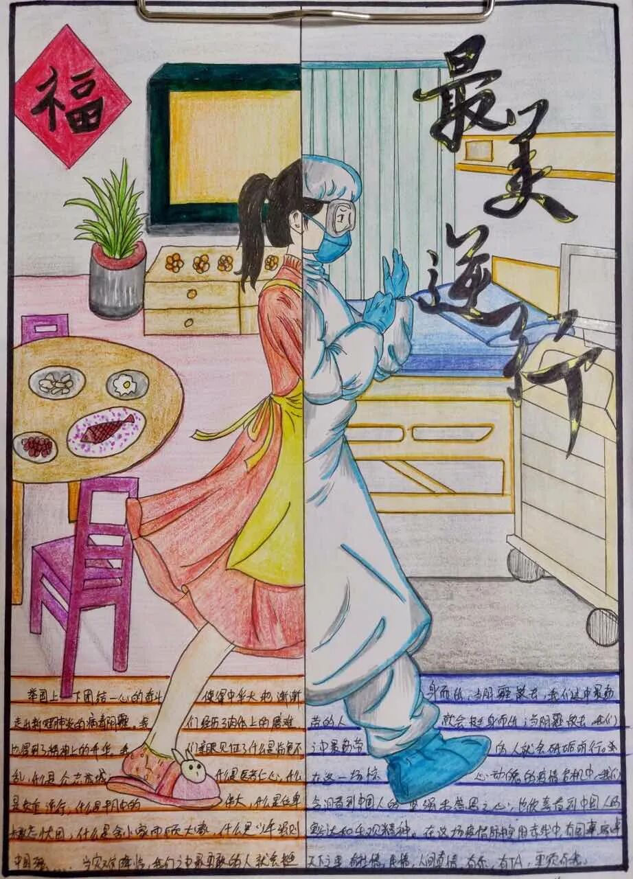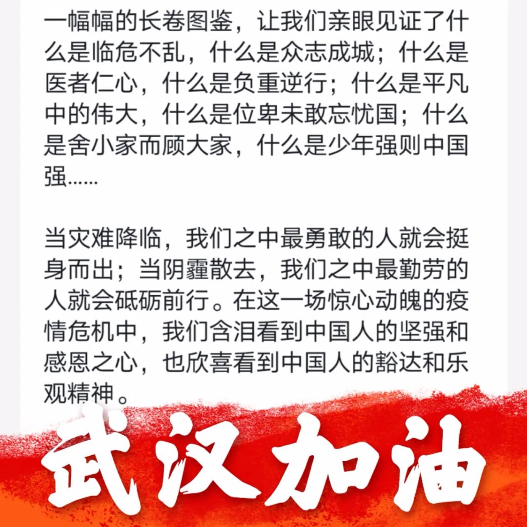 “仁心者志愿者逆行者,者者共行;温暖生希望生奇迹生,生生不息”。当黑夜降临,我清晰地看到一束光冲破黑暗,那束光聚集着每一个充满希望的力量,击败黑暗。鲁迅先生曾经说过:“我们自古以来就是有埋头苦干的人,有拼命硬干的人,有为民请命的人,有舍身求法的人,这就是中国的脊梁。”身居斗室中的我们,虽然不能像你们一般冲锋陷阵,但是我们也要用对生命的热爱,对前路的执着和对理想的追求,化作强有力的浪花,击破这疫情的洪流。相信不久,春风十里会再度抚绿神州大地,膏壤沃野会再度沐浴黎明朝阳。待到樱花烂漫时,江城无恙展新颜。