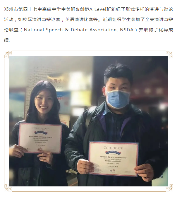 恭喜郑州47中中美班学子NSDA辩论赛取得佳绩