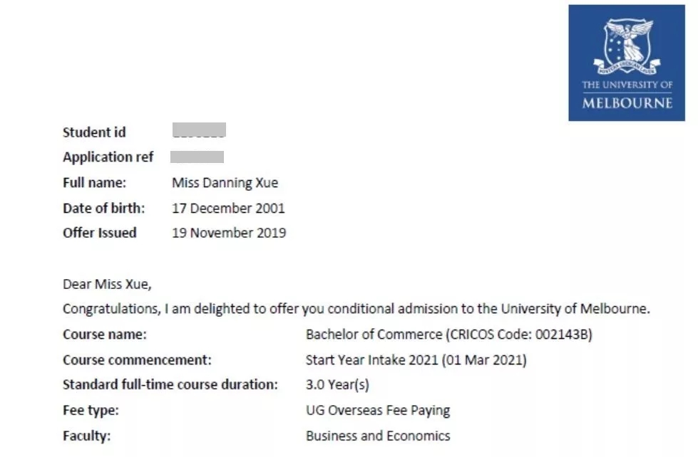 在收到剑桥面试信的同时,薛丹凝同学分别又收到了来自英国 伦敦大学学院 和澳大利亚 墨尔本大学、悉尼大学 共计三所名校的录取通知书。
