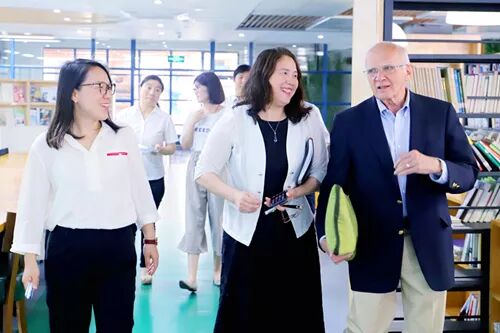 上午九点,骄阳似火也挡不住老友再见寒暄的热情。魏德曼博士一下车,早已等候多时的郑州47中老友们就迎了上去,他们互相握手、问候、拥抱。述不完的情,说不完的话,再次重逢倍感亲切。随后,魏德曼博士在47中领导和教师代表们的带领了参观了校园,气势恢宏的报告厅、宽敞明亮的录播教室、书香氤氲的图书馆、古朴典雅的国学教室让他连连称赞;热情、友好的47中友人们更是让老校长深受感动,欢声笑语中透着重逢的喜悦。老友相见总是分外热络,一行人在图书馆相对而坐,分享着自己记忆中的美好点滴。随后,以“友谊&发展”为主题的“郑州47中——约翰逊大学交流会”在学校第一会议室隆重举行。