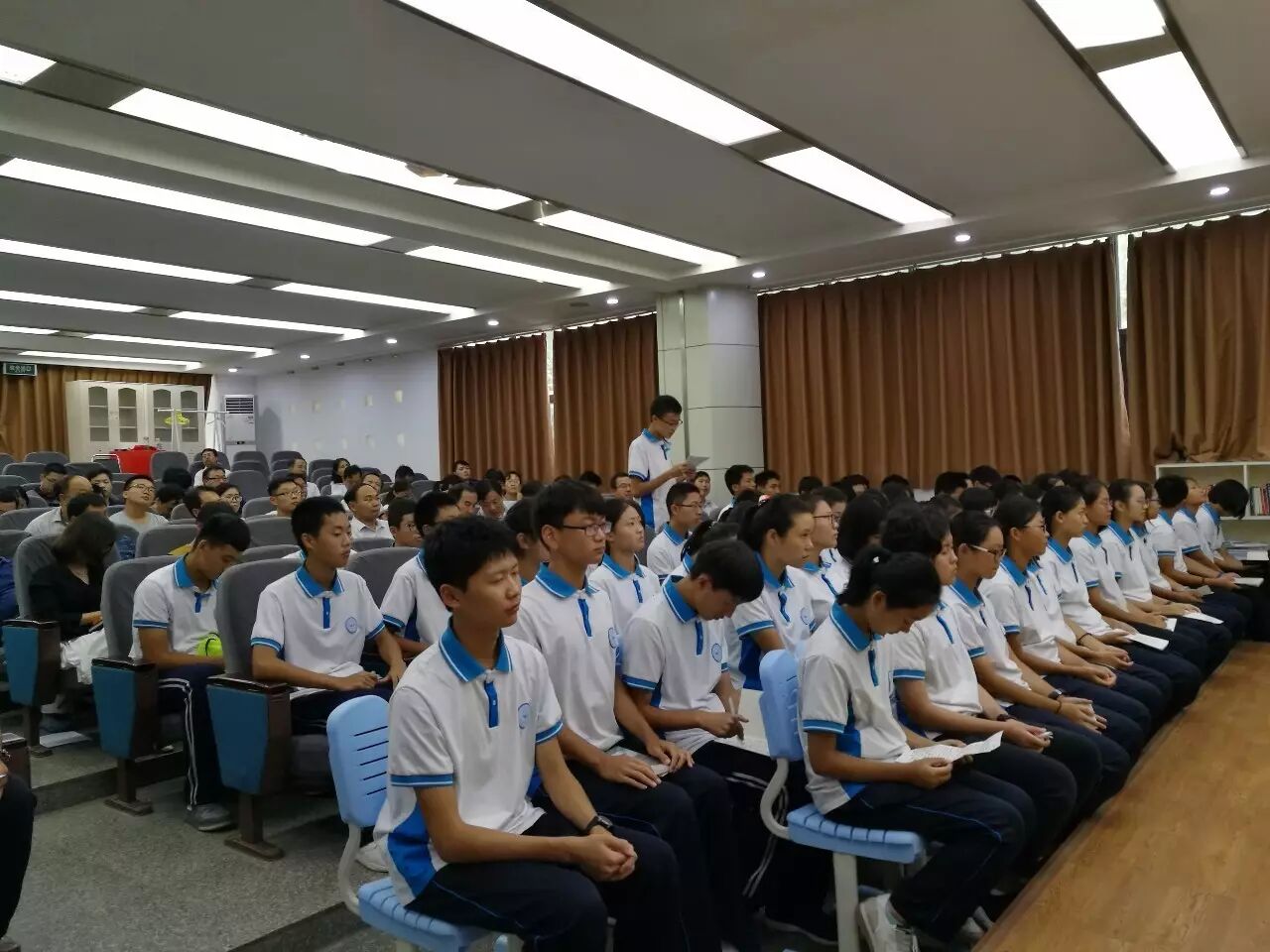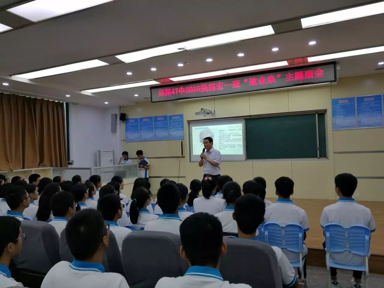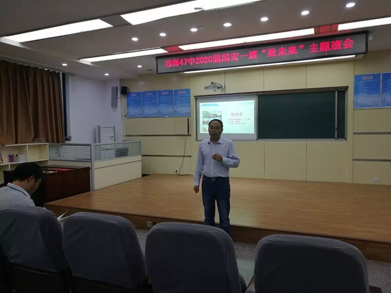 9月1日下午,在郑州47中高中部的一号合班教室,张建涛老师带领着2020届国宏一班的学生们举办了一场以“致未来”为主题的班会展示课,47中副校长栗红涛、德育处主任胡庆周、德育处副主任李大民、各年级主管主任、班主任及部分学生家长到现场进行了观摩、学习。